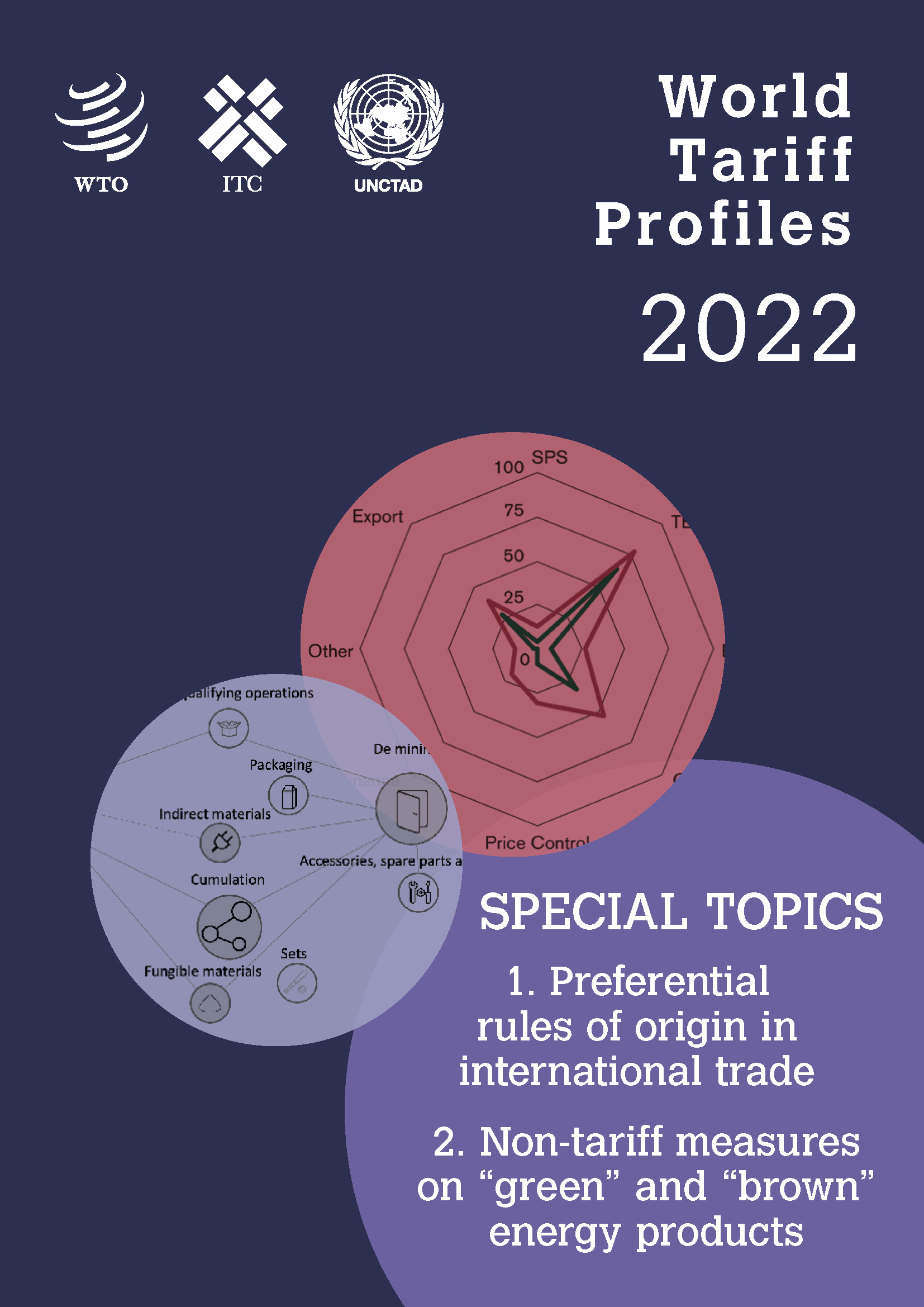 World Tariff Profiles 2022 provides comprehensive information on the tariffs and non-tariff measures imposed by over 170 countries and customs territories. The publication starts with a breakdown of the tariffs imposed by these economies. Tariff data are presented in comparative tables and in one-page profiles for each economy. A summary table on selected indicators on the imports and exports profile for these economies is also presented. Statistics on non‑tariff measures by country and by product group complement the data on tariffs. Under the special topics part, there are two technical papers. The first one analyses the preferential rules of origin in international trade and the second one focuses on non-tariff measures on “green” and “brown” energy products. The publication is jointly prepared by the World Trade Organization, the United Nations Conference on Trade and Development (UNCTAD) and the International Trade Centre (ITC).